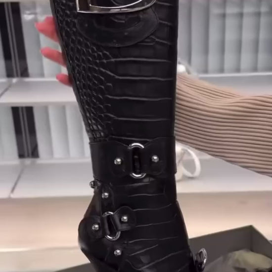 Botas altas en acabado efecto piel croco negro, con diseño elegante y atrevido. Presentan punta fina, tacón de aguja estilizado y hebillas metálicas en tono plateado que destacan por su carácter sofisticado. El detalle del logo en relieve añade un toque exclusivo, convirtiéndolas en un accesorio imprescindible para un look glamuroso y lleno de actitud.